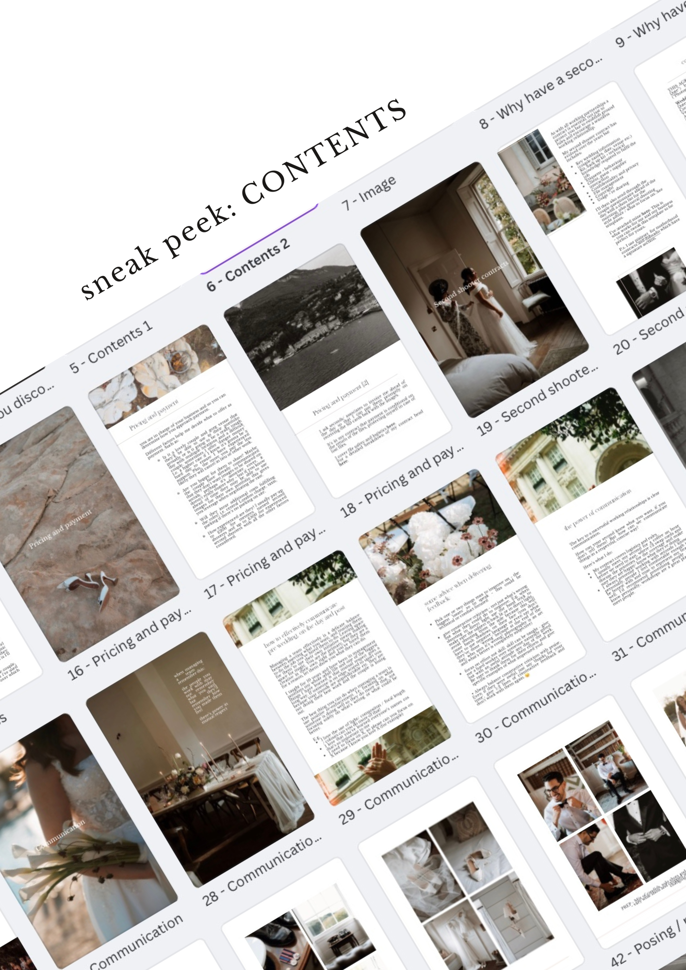 This guide is packed with tried and tested advice, expert tips, and easy-to-adapt templates including POSING + PROMPTS GUIDES, A SECOND SHOOTER CONTRACT TEMPLATE + MORE